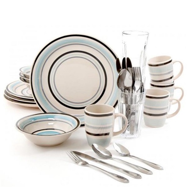 Combination set is convenient and stylish. Colorful pattern dinnerware. Stainless steel flatware. 4 piece tumbler set Stoneware dishes Stainless steel construction Dishwasher-safe dinnerware set.