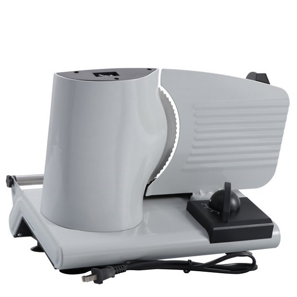 - Works great for virtually all types of foods including meats, cold cuts, vegetables, cheese, frozen food, and even soft-crust bread. Features a 7-1/2 in. stainless-steel hardened serrated blade for precision cuts. Thickness can be easily adjusted up to 9/16 inch depending on the food being sliced and individual preferences Plastic food pusher for more protection when slicing Tilt Angled base for easier, more precise slicing4 nonslip feet for steady located when running Removable sliding table for easy cleaning Upgraded Switch Design, the left Ⅰ indicates normal ongoing working model, the right Ⅱ means safe control model which needs holding the button to keep working.