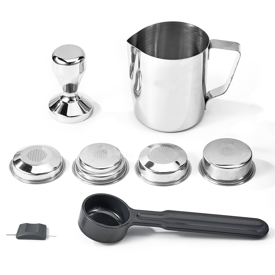 - Accessories Universal portafilter holder 1 or 2 cup filters in both pressurized and non-pressurized options (4 total) 12oz stainless steel milk frothing pitcher Filter cleaning tool Heavy duty metal tamper Measuring scoop