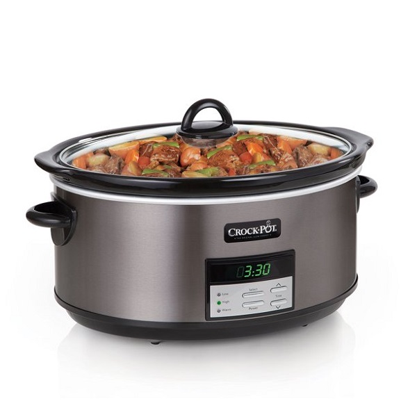 With its blend of style and superior performance, the Crock-Pot Black stainless programmable slow cooker is the perfect choice for your kitchen’s matter your decor. Its innovative finish is warmer and softer than traditional stainless steel, and it requires minimal maintenance to retain a lustrous appearance. Simply wipe with a dry cloth to remove any smudges in seconds. This slow cooker also features an 8-quart Capacity capable of feeding over 10 people, a digital timer that counts down cook times of up to 20 hours, and an automatic warming function that kicks in when your countdown is done. When your meal is done, cleanup is a snap thanks to the removable, dishwasher-safe lid and stoneware pot. Need ideas for dishes to make? a book of classic Crock-Pot recipes is included.
