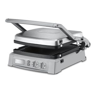 The Cuisinart Griddler Deluxe takes grilling to new heights! It offers six enticing cooking options. The reversible grill and griddle plates, combined with dual-zone temperature control, give home chefs complete control. This grill is perfect for making pancakes and eggs for breakfast, panini and open-faced sandwiches for lunch, and burgers or fajitas for dinner. The extra-large grilling surface is ideal for entertaining a crowd or making family meals. The new SearBlast feature locks in the flavor of steaks. With dishwasher-safe accessories, an elegant look, and 1800 watts of power, deluxe is an understatement. Features: Six cooking options in one: contact grill, panini press, full griddle, full grill, half grill, half griddle, top melt Removable, reversible and nonstick grill/griddle plates Dual-zone temperature control Sear function – can sear at 500 degrees F for up to two minutes at a time Adjustable top cover with 6 presets to top melt and lock for storage Large grilling surface: 240 square inches open Brushed stainless steel housing Integrated drip tray Cleaning/scraping tool All accessories are dishwasher safe Red/green LED indicator lights Instruction/recipe book Limited 3-year warranty