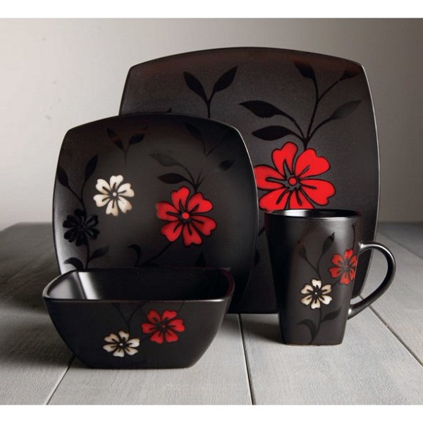 This Gibson 16-Piece Evening Blossom Dinnerware Set features a black satin design with blossoms in pops of white and red color. It includes four dinner plates, four salad plates, four bowls, and four mugs. The ceramic dinnerware set is conveniently dishwasher-safe for easy care and cleanup. It is an ideal addition to all of your kitchen and serving needs or it makes a wonderful gift for any wedding or housewarming occasion.