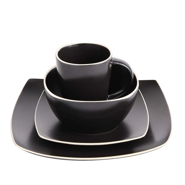 The Gibson Elite Solo Lounge Matte Black 16 piece dinnerware set adds a stylish and modern look to your table with both simplicity and elegance.A sleek and smooth matte black finish brings deep and solid color. Exposed white rims add a splash of contrast that brightens the look of these pieces. Constructed with all-natural clays for a thick build, these sets are durable and will furnish your family and guests’ meals for years to come. In addition to durability, these dinnerware pieces are easy to care for; they are dishwasher and microwave safe.With this 16 piece set, you’ll have all the pieces you need to serve in style. Included are (4) 12.5-inch dinner plates, (4) 7.75-inch dessert plates, (4) 6.25-inch bowls, and (4) 12-ounce mugs. You’ll have the flexibility to deliver any of your meals to those you care about.No matter the occasion or setting, the Gibson Elite Solo Lounge 16 piece dinnerware set will add a modern classy touch to your meal.