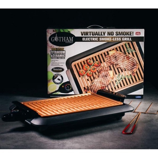Prepare delicious dishes for yourself or for the entire family. Take Korean barbecue right at your kitchen with the Smokless Grill. Cook juicy and tender steaks, sausages, chicken, shellfish or other seafoods and even vegetables. The convenient cooking or temperature dial ensures the food is just cooked right, and the ease of setting it up makes the Smokeless Grill the perfect partner for small parties with friends on a Saturday night! The Gotham Steel Smokeless Grill is the ingenious new way to cook and BBQ indoors without all that smoke. It has a convenient temperature dial that maintains perfect heat across the entire surface for perfect grilling every time. Plus, the Smokeless Grill features a heated grilling grate allowing oils and fats for healthier eating to drip into a pan that cools the oils and fat, so smoke can’t form. So, food like bacon stays crisp yet juicy and with a lot less fat. And like all our Gotham Steel products it’s made of Ti-Cerama surface which combines super strong titanium with super slick ceramic which means sticking or scratching is a thing of the past. Making healthy grilling and cleaning super easy and super fun! So, go ahead and BBQ hot dogs, hamburgers, chicken, salmon ribs and even desserts right in your kitchen, because you know it won’t stick to the grill.