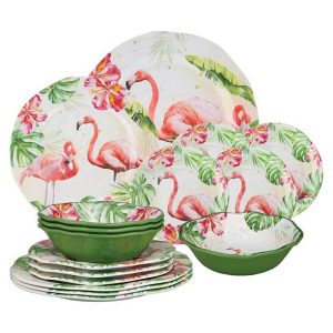 Product details Gourmet Art 16-Piece Flamingo Heavyweight and Durable Melamine Dinnerware Set, Service for 4. Includes Dinner Plates, Salad Plates, Dessert Plates and Bowls, Everyday Use.