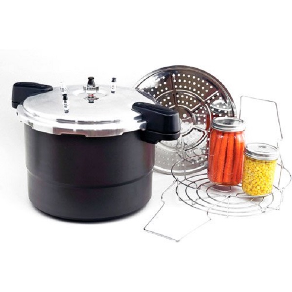 The Granite Ware 20-Quart Pressure Cooker is a professional-quality tool, made of heavy-duty anodized aluminum, with stay-cool handles and a strong-lock steel lid. The hard anodized finish is ultra durable and means this can be used as a pressure cooker or steamer without changing the flavor or color of food. An accompanying rack fits down into the pot to keep jars up off the bottom, so that liquid can circulate underneath. In addition to a pop-up pressure indicator and a simple steam release mechanism, pressure canner has controls of internal pressure, which eliminate the need for constant monitoring and calibrating a pressure gauge. The Granite Ware 20-Quart Pressure Cooker pressure dial gauge gives an accurate reading so that pressure can be kept constant during canning.