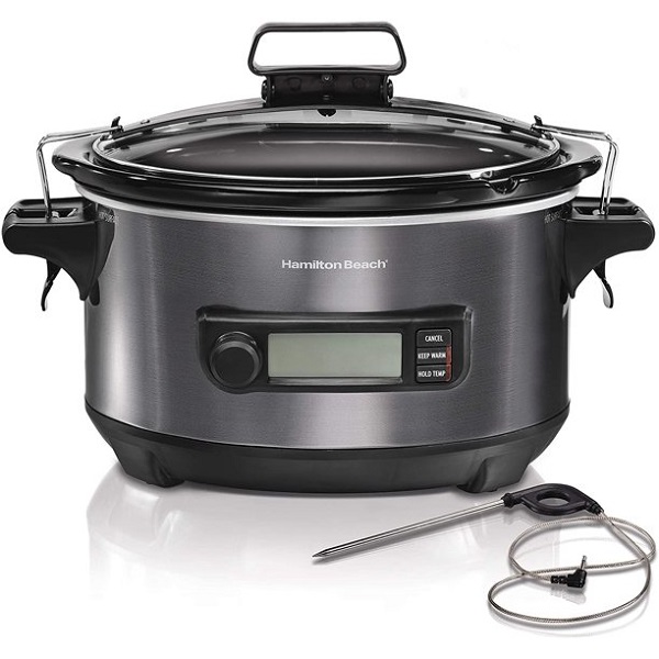 Hamilton Beach Portable 6-Quart Digital Programmable Slow Cooker With Temp Tracking Temperature Probe to Braise, Sous Vide, Make Fondue & Yogurt, Lid Lock, Black Stainless (33866)