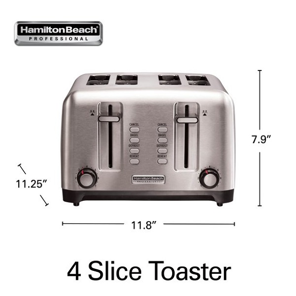 The Hamilton Beach® Professional 4 Slice Toaster helps you make great meals even on busy mornings. Four wide, deep slots and bagel, defrost and reheat settings easily accomodate oversized artisan breads, frozen waffles, pancakes, bagels and more.