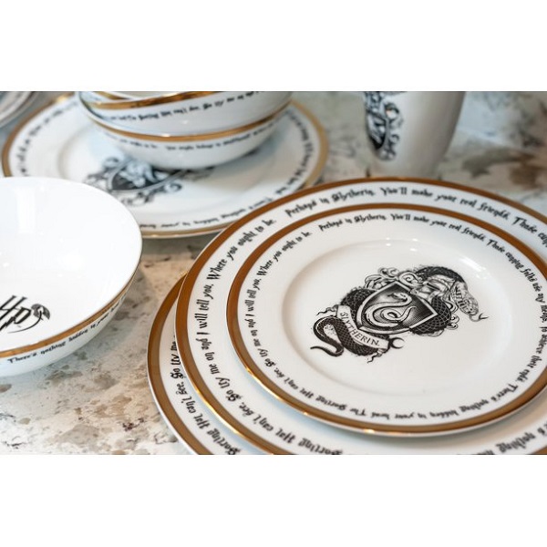 - Elegant Styling: Each dinnerware place setting depicts a unique Hogwarts House: Gryffindor, Hufflepuff, Ravenclaw, and Slytherin. The Sorting Hat’s poem is also featured on the plates and bowls, tying all the pieces together in a cohesive style.