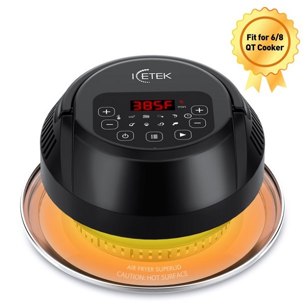 - Our Iceteck air fryer lid for instant pot is easy to cook your delicious meals with one-touch smart program comes with deep basket, steam rack, food clip, silicone pad. Turns Your 6&8 Qt Pressure Cooker into Air Fryer/Dehydrator/Broil.Cooks by 360°circulating hot air, which can offer you crunchy food with little to no oil, let your lover eat healthier!