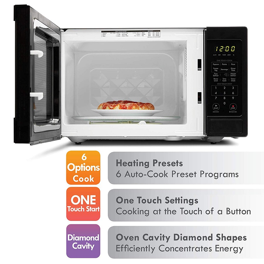 COMPACT MICROWAVE OVEN ADA compliant 0 9 cubic feet countertop microwave oven is perfect for small office kitchens RVs and apartmentsPOWER AND CONVENIENCE Countertop microwave has 10 power settings at 900 watts an add 30 seconds button option and a safety lock to keep kids safeHEATING PRESETS One Touch Auto-Cook preset programs take the guess work out of heating your favorite foods like pizza potatoes popcorn frozen vegetables beverages and dinner platesEXPRESS COOKING With the One Touch express heating settings you can quickly start cooking for 1-6 minutes instantlyDEFROST QUICKLY Frozen foods are defrosted quickly with the Time or Weight defrost settings
