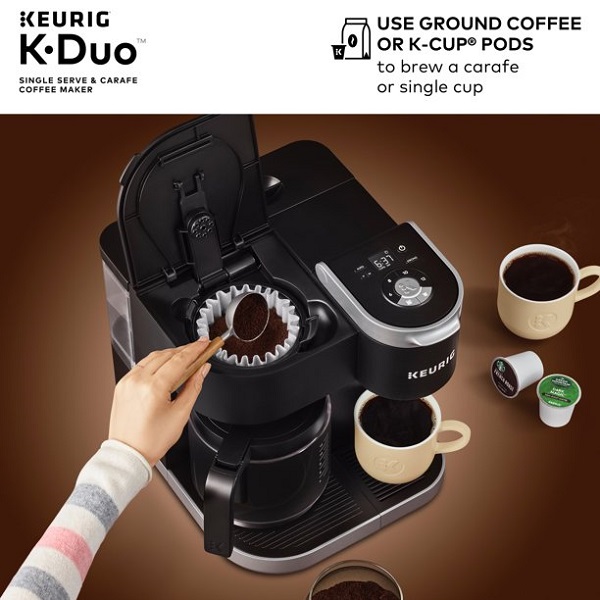 Introducing the K-Duo™ Single Serve & Carafe Coffee Maker in Black: the perfect brewer for any occasion. This versatile brewer is the best of both worlds, using both K-Cup® pods and ground coffee to brew a cup and a carafe of your favorite varieties. The included 12-cup glass carafe and heating plate are perfect for keeping your coffee hot, and the added convenience of the Pause & Pour feature makes serving a snap! No need to wait for the entire carafe to brew – the Keurig® K-Duo™ coffee maker can be paused mid-brew for 20 seconds, so you can pour fresh, hot coffee right away. Or set your preferred brew time up to 24 hours in advance and enjoy a freshly brewed carafe right when you want it with Programmable Carafe Auto Brew. Create your perfect cup and carafe every time with the K-Duo™ coffee maker. Choose your favorite ground coffee, or choose from hundreds of delicious K-Cup® pod varieties of coffee, tea, cocoa, and more. Use the Strong Brew button for a bolder, more intense single cup. With multiple brew sizes, you can make a 6, 8, 10, or 12-cup carafe for large gatherings, as well as a 6, 8, 10, or 12 oz. cup just for you. You can brew the perfect amount of fresh, full-flavored coffee whether you’re hosting friends or just enjoying a cup – and a moment – to yourself! Based on consumer feedback, we have updated the K-Duo Brewer. Customer reviews have been removed that relate to the previous version of the brewer