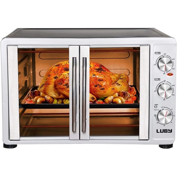 Prepare a big meals for your friends or the whole family with Luby extra large toaster oven! This countertop oven can easily fit 18 Slices of bread, a big 14” pizza or a 20lb Turkey! This electric oven features separate temperature controller for up and low heating tubes and has four positions for racks and pans, provides maximum cooking flexibility. More at a time. With 60 minute timer, your foods cook as long as you need, then the oven shuts off automatically. Luby french door toaster oven allows to open a single door to check on food, without letting too much heat escape from the oven and stainless steel interior is easy to clean up. Technical Specifications: Color: Silver Front, Black Housing Item Dimensions: 22. 04 x 16. 14 x 14. 37 in Interior Dimensions: 16-3/8 W x 15-7/8 D x 8-1/2 H (upper element to rack at lowest position) Material: Iron Voltage: 120V/ 60Hz Power: 1800 watts Accessories include: bake tray(1pc) bake tray handle(1pc) wire rack(2pc) crumb tray (1pc)