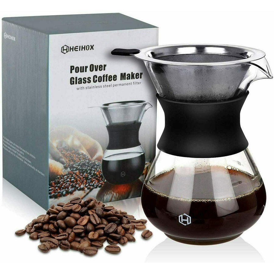 Heihox Pour Over Coffee Maker Set – 14 oz Pour Over Coffee Dripper with Reusable Stainless Steel Cone Filter and Carafe