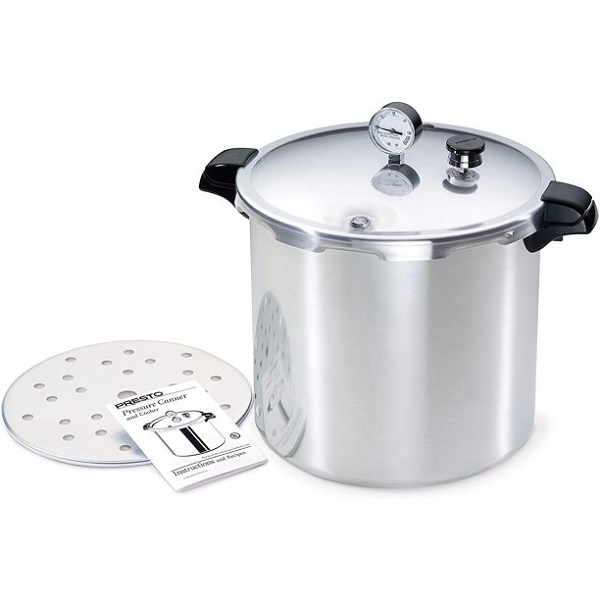 Pressure canning is the only method recommended safe by the U.S. Department of Agriculture for low-acid foods. Doubles as a boiling water canner for preserving fruits, jams, jellies, pickles and salsa in pint and half pint jars. Also handy as a large capacity pressure cooker. Constructed of warp-resistant, heavy-gauge aluminum for fast, even heating. Works on regular and smooth-top ranges. Deluxe pressure dial gauge registers the complete range of processing pressures. This precise measurement is especially important at higher altitudes. Air vent/cover lock allows pressure to build up only when the cover is closed properly and prevents the cover from opening until pressure is safely reduced. 23-Quart liquid capacity 21.8 liters.