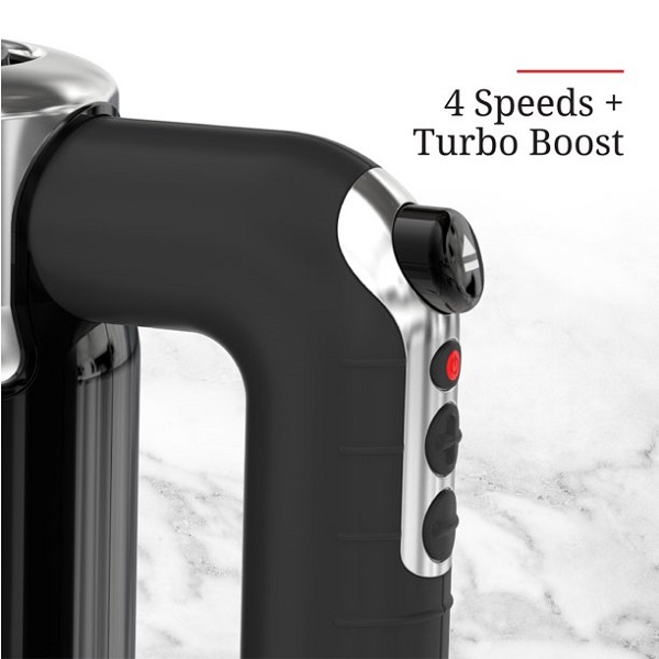 - 4 Speeds + Turbo Boost: Start with slow speed to avoid spatters, then increase as needed. Turbo boost setting is perfect for thick dough and batter.
