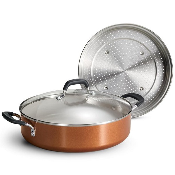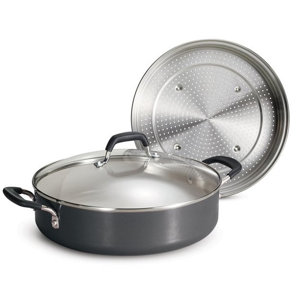 Meet your new favorite pan for steaming, frying, sautéing, searing, browning, deglazing and braising family-sized dishes. The Tramontina Nonstick Everyday Pan is an all-in-one marvel for cooking everything from bacon to steak to casseroles. Constructed of heavy-gauge aluminum for quick and even heat distribution, the heavy-duty pan is oven-safe up to 350° F for stovetop-to-oven meals.