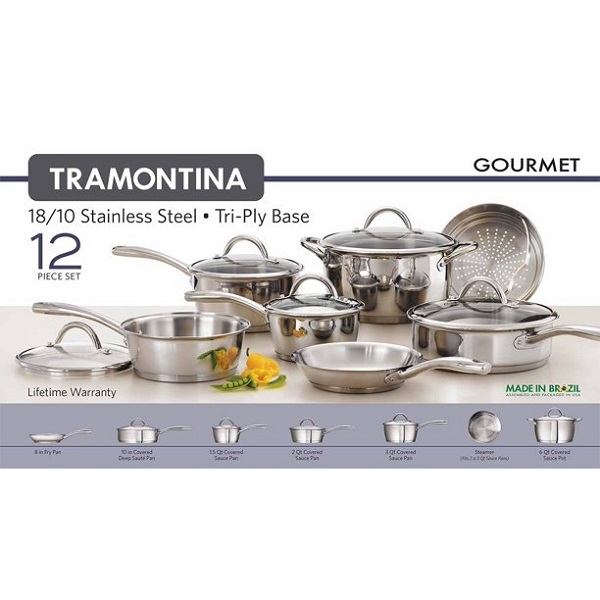 Tramontina Gourmet Stainless Steel Tri-Ply Base Cookware Set, 12 Piece