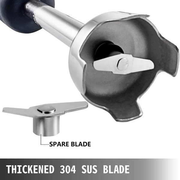 This high-performance immersion blender makes quick work of food-prep tasks, which can blend smoothies, puree soups, mix cake batter, chop nuts and meat, and more. All the parts that attached to food are made of 304 stainless steel, safe and sanitary. The extra-long shaft is designed for deeper reaching of the pots or bowl. The high rotation speed is perfect for commercial use.